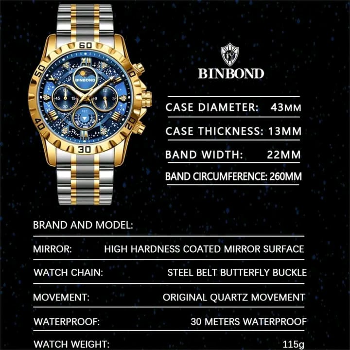 - Model: BINBOND 7741, a premium vandeniui atsparus laikrodis