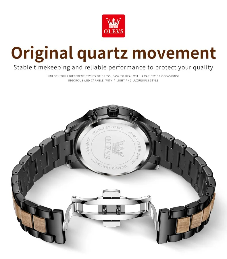OLEVS 3645 Wood & Steel Moon Phase Chronograph