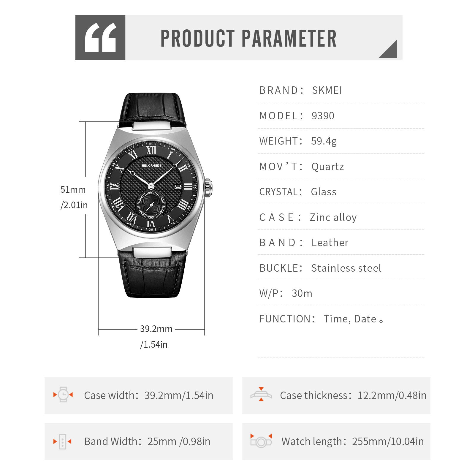 Experience classic style with the SKMEI 9390 Men’s Roman Dial Leather Watch. Your purchase includes: